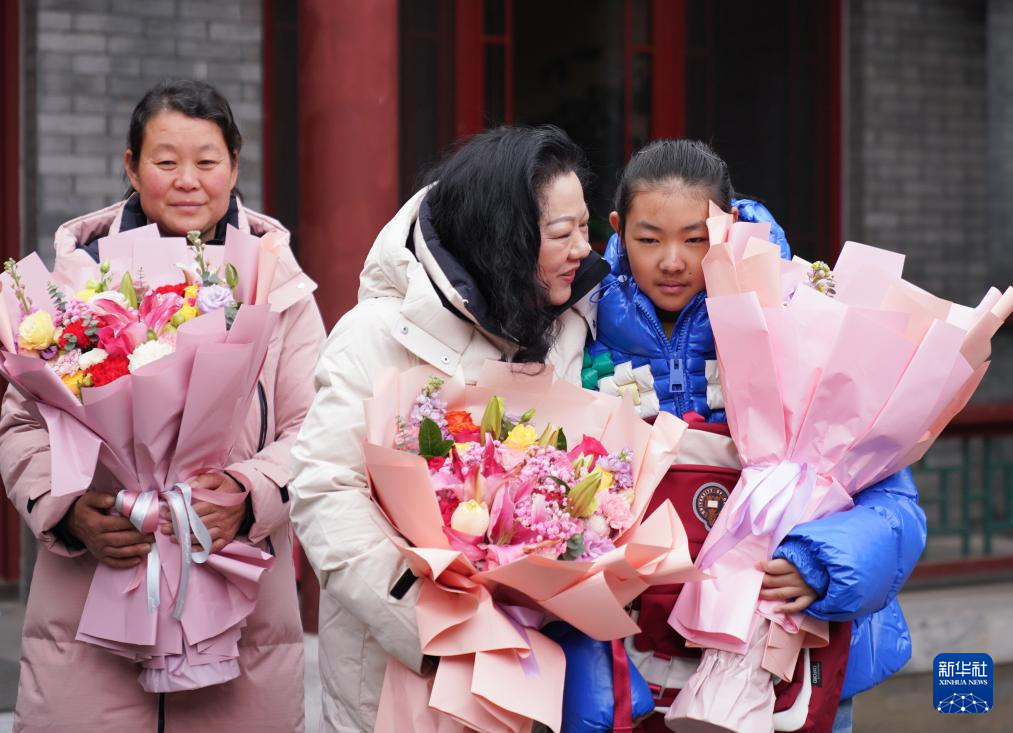 1月4日,“海空卫士”王伟烈士妻子阮国琴(中)在与“人民英雄”张超烈士女儿张上明珠交流。