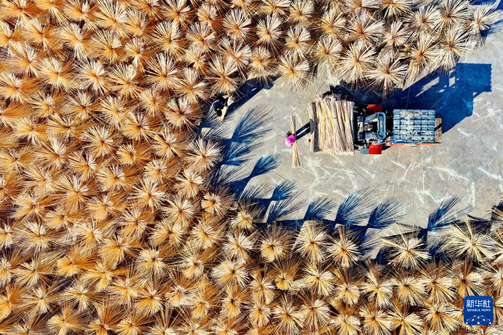 1月5日,在江西省抚州市广昌县头陂镇塘下村的一家竹制品加工基地,村民在晒场晾晒竹丝(无人机照片)。