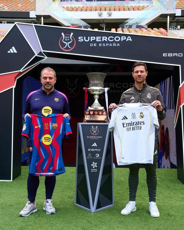 赛前,按照传统,巴萨主帅弗里克和皇马主帅哈维-阿隆索在冠军奖杯前合影,两人各自举着球衣,并握手致意。