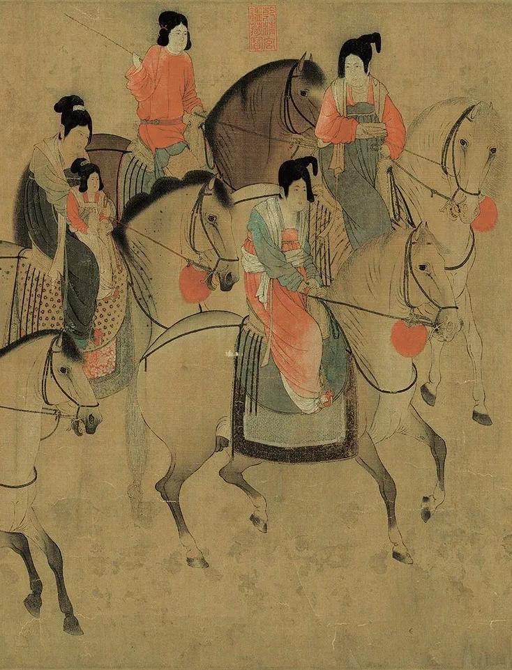 此图描绘的是天宝十一年(752年),再现唐玄宗的宠妃杨玉环的三姊虢国夫人及其眷从盛装出游,“道路为(之)耻骇”的典型环境。