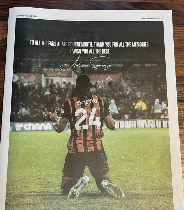 当地时间1月10日,已经转会曼城的塞门约在《伯恩茅斯回声报》上刊登了一整版广告,向伯恩茅斯的球迷表示感谢。