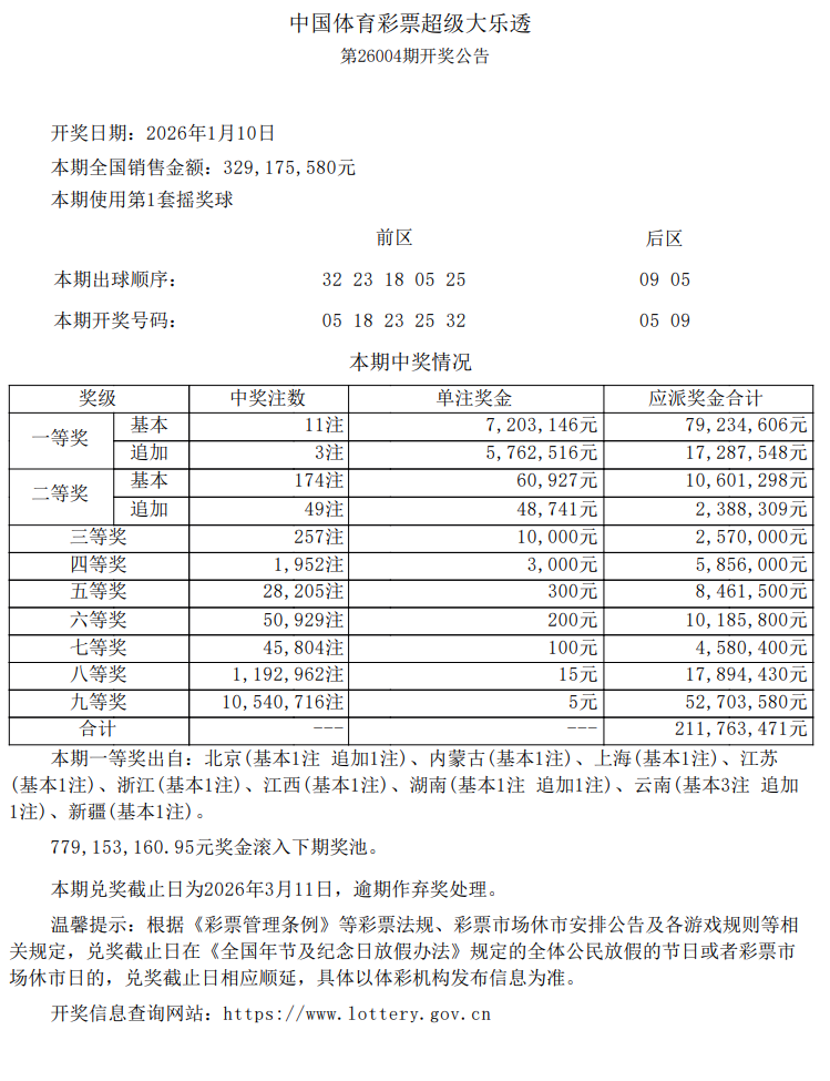 大皖新闻讯 1月10日晚,中国体育彩票超级大乐透第26004期开奖公告发布,当期开出11注一等奖。