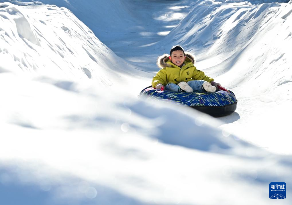 1月10日,一名小朋友在祁连县阿咪东索林海露营基地体验冰雪项目。