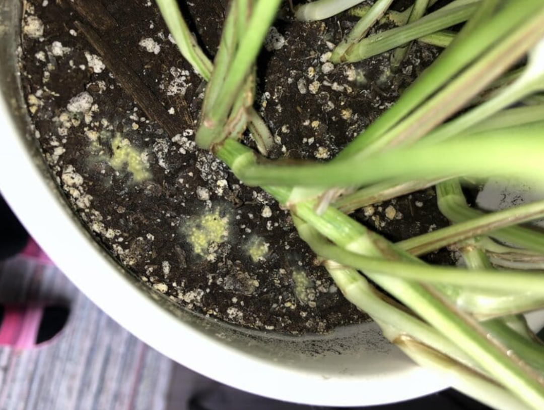 刚浇完水没几天,花盆表层和四周就冒出一层白花花的霉菌,有的还带着黄色斑点。是不是这盆土有什么病菌?要不要把土换掉?