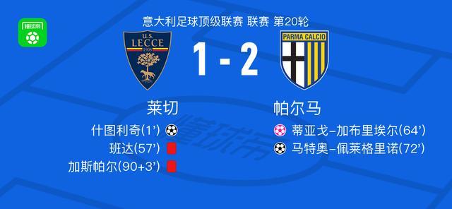 北京时间1月11日意大利足球顶级联赛 联赛 第20轮,莱切主场对阵帕尔马。莱切什图利奇破门,蒂亚戈-加布里埃尔自摆乌龙。帕尔马马特奥-佩莱格里诺破门。最终比分莱切 1-2 帕尔马。
