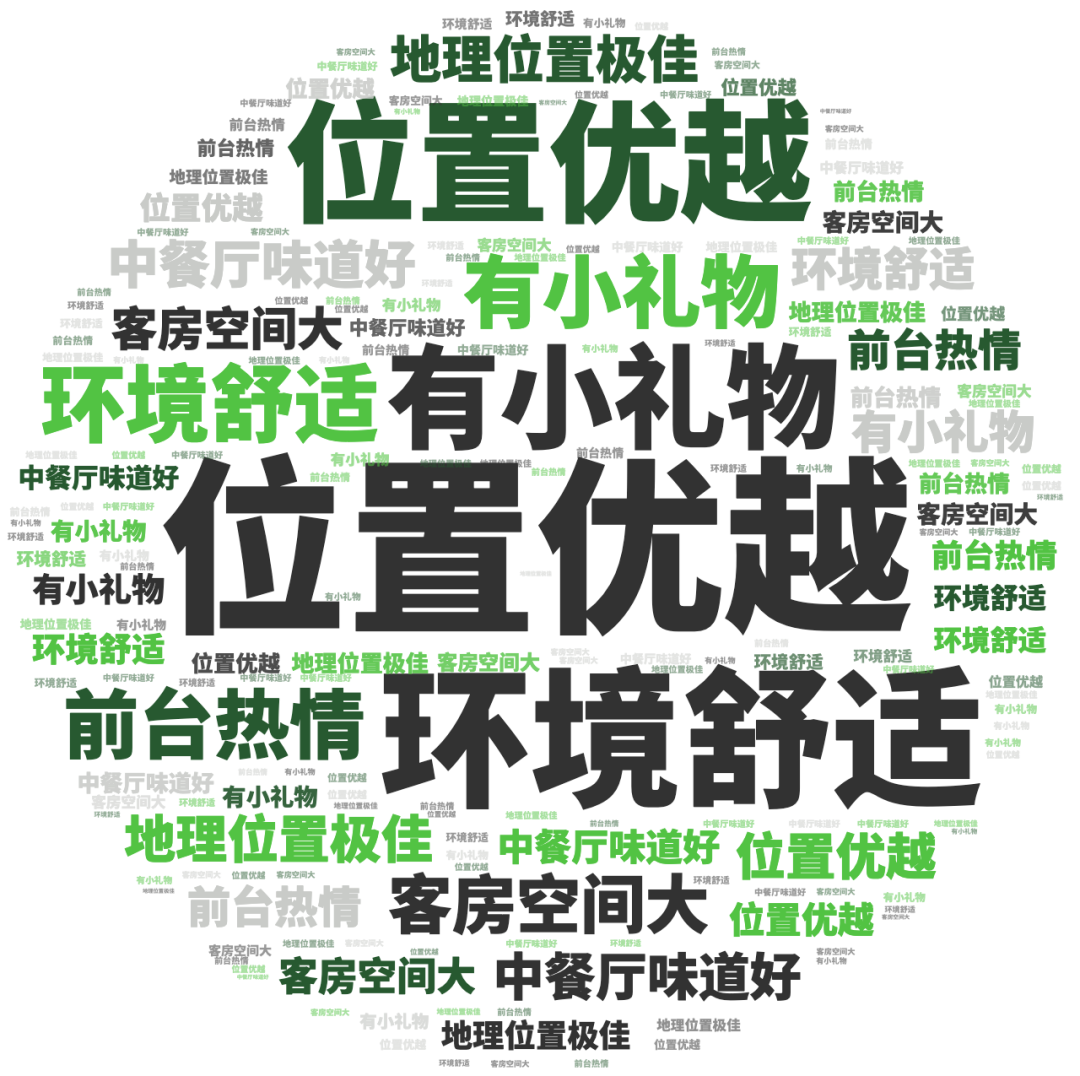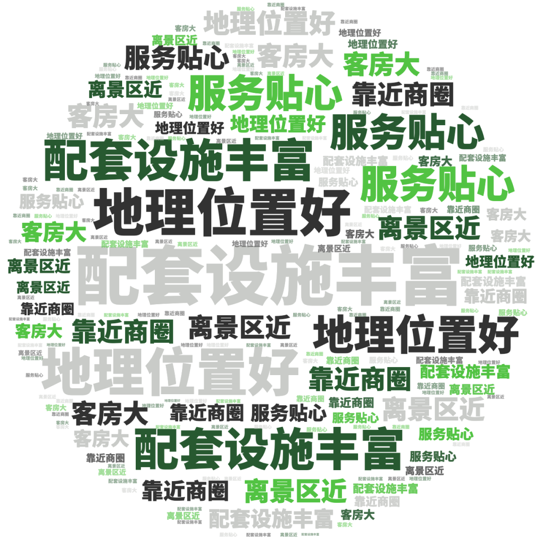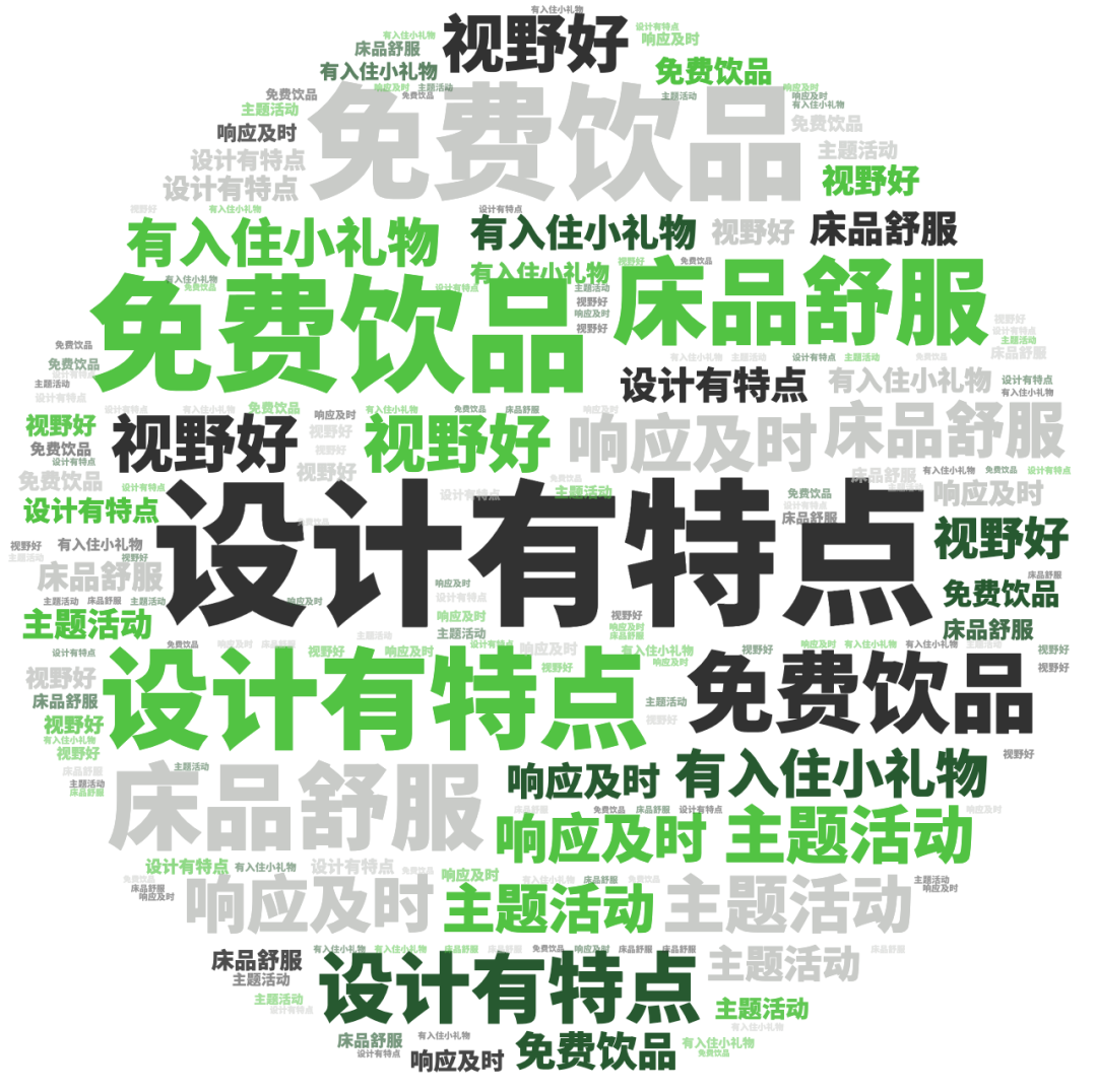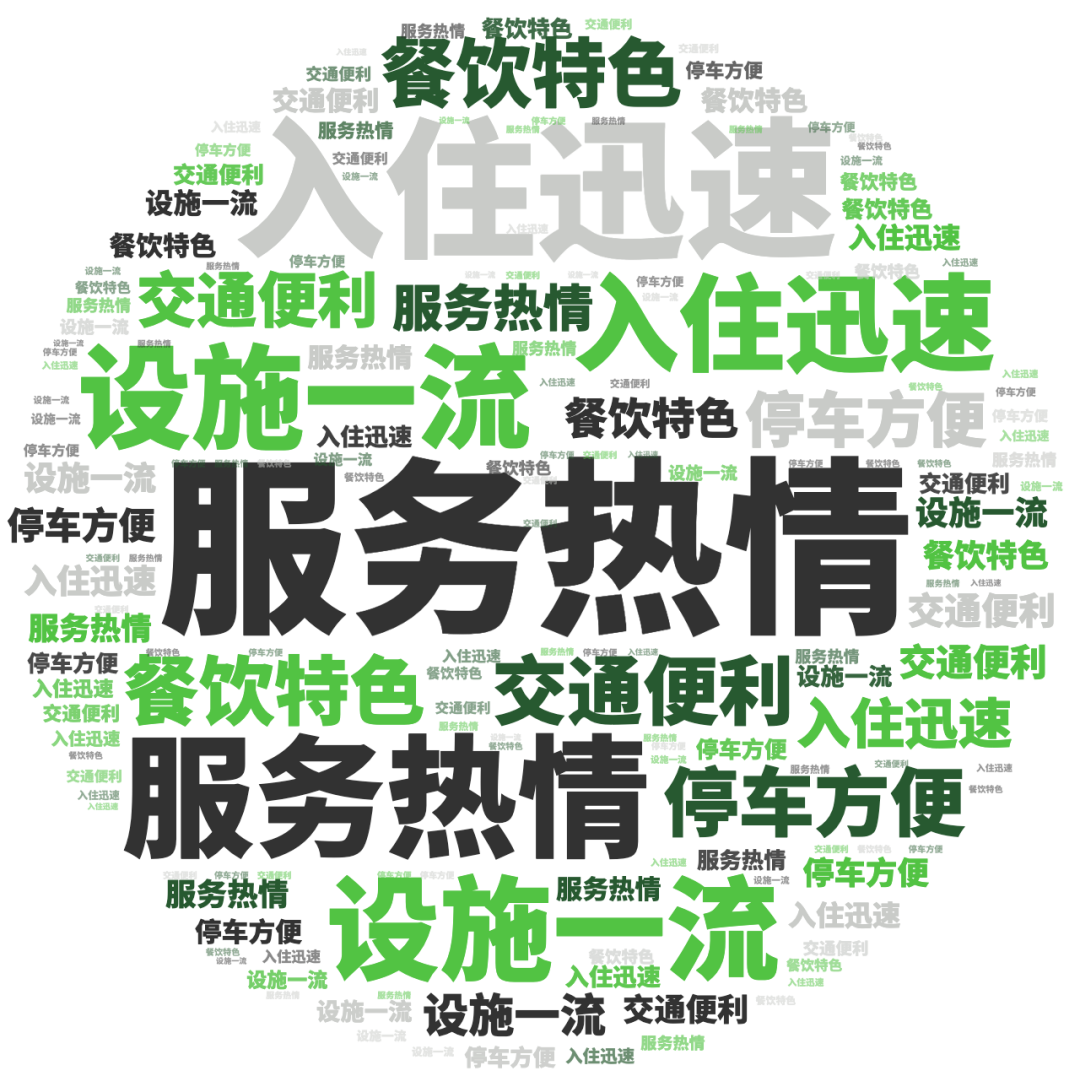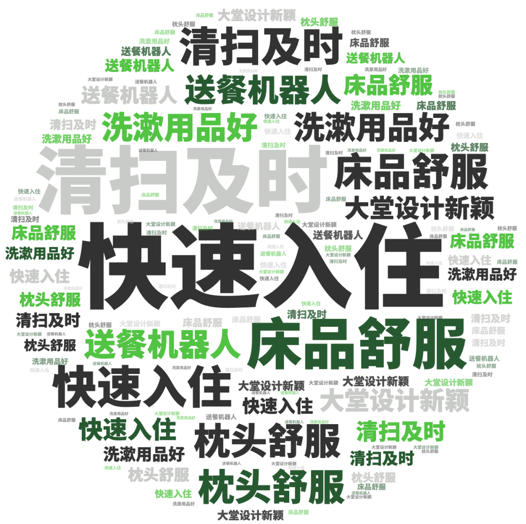 点评指数:国际高端酒店点评指数平均得分达103.19分,本月指数有较为显著的下跌,好评维度平均是差评维度的1.1倍,本月并未有300分品牌出现。好评关键词主要是国际高端酒店的靠近景区、交通便利、会员福利多等方面。差评关键词主要集中在停车不便、华而不实、服务态度一般等方面。