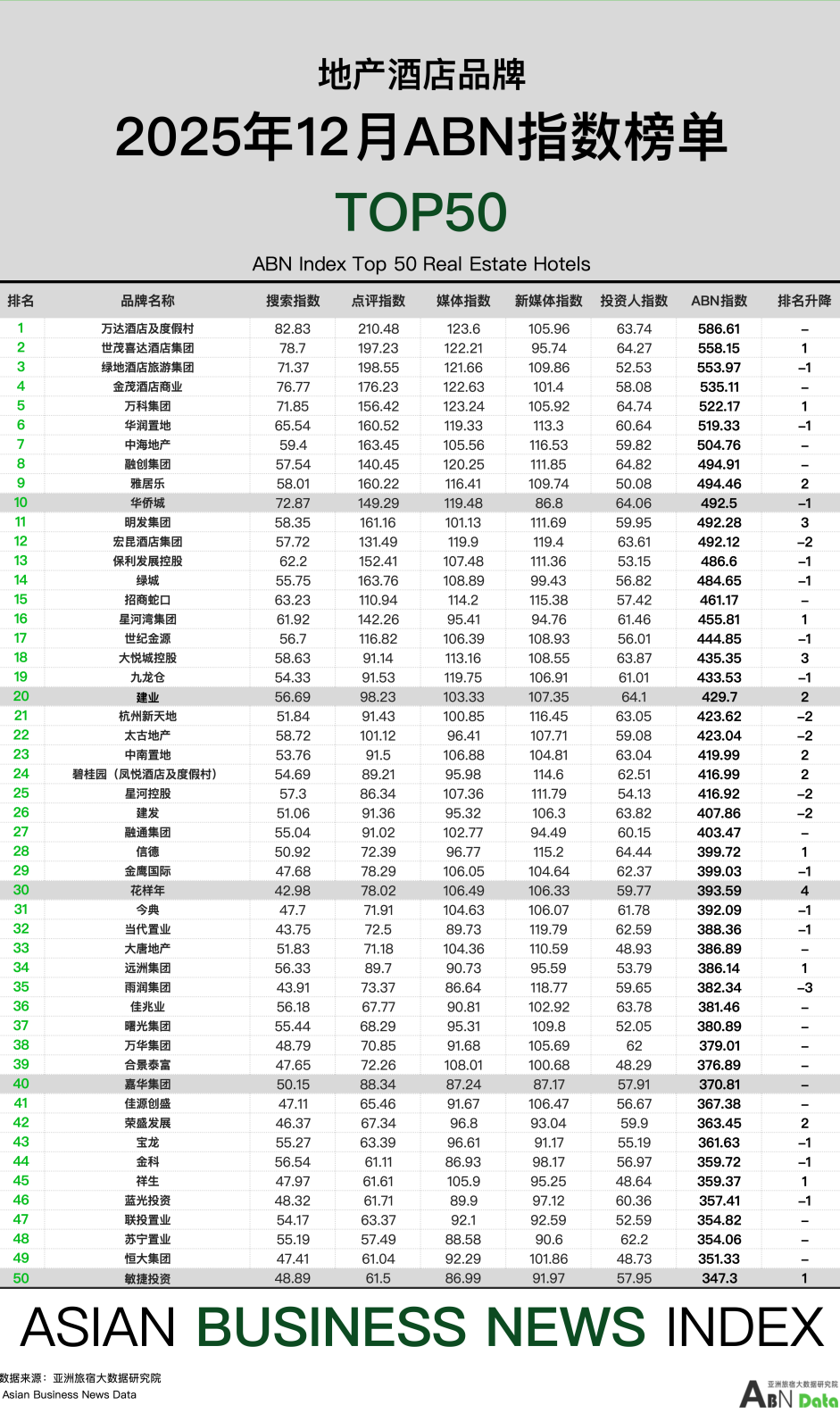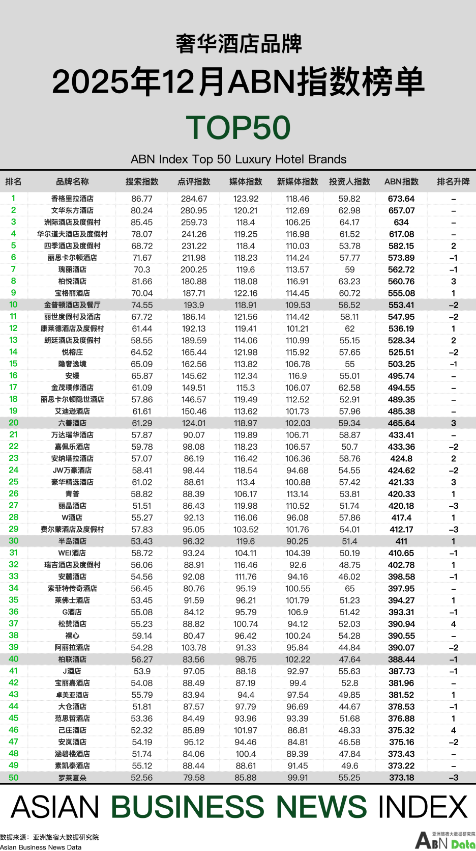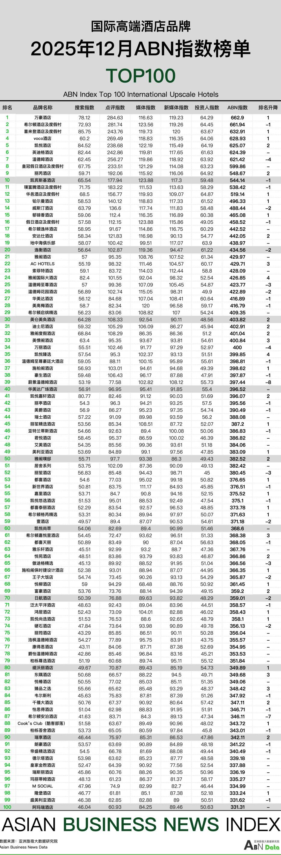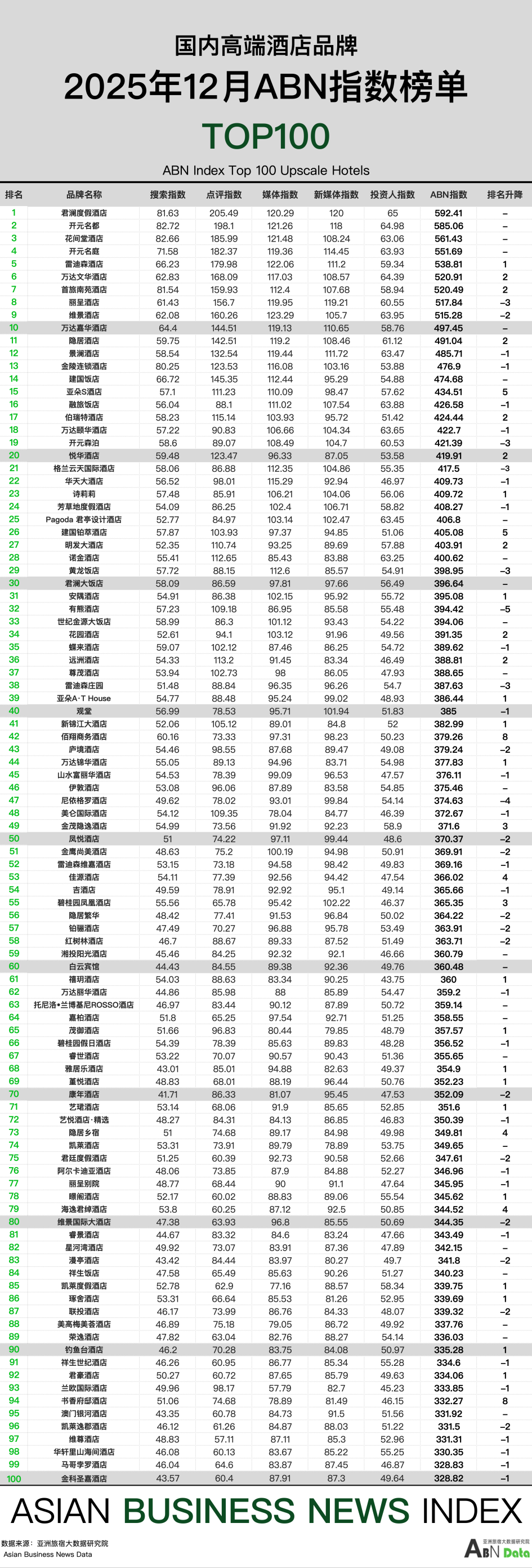 综述:2025年12月,国内高端酒店的搜索指数、点评指数和新媒体指数保持高位,五个指数监测综合平均得分达到了390。