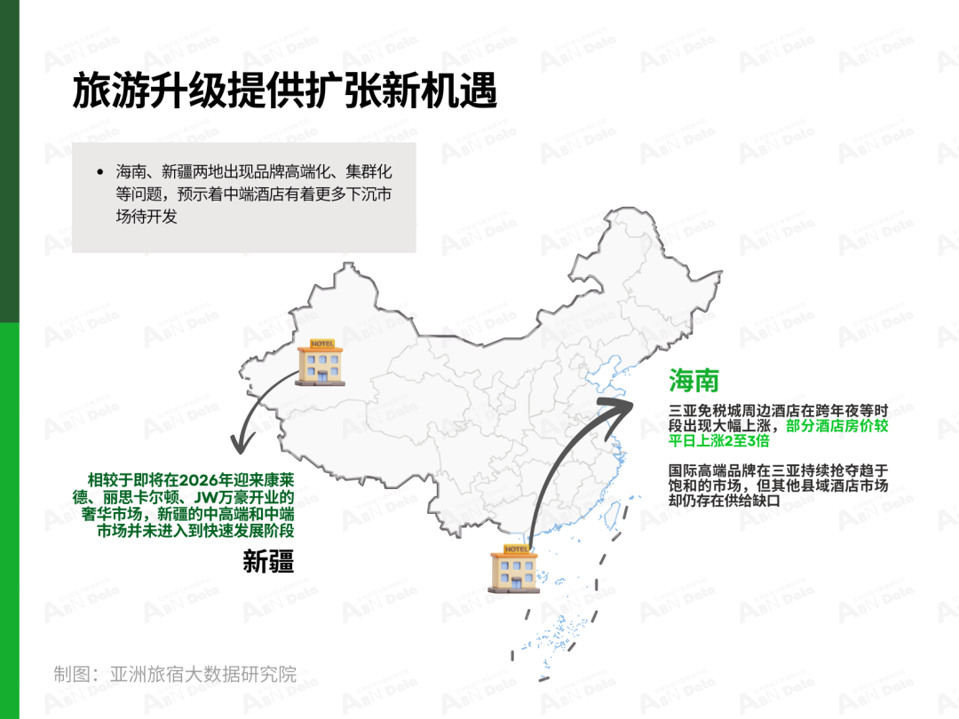 作为冬季旅游的两大热门市场,海南、新疆两地出现的品牌高端化、集群化等问题,也预示着中端酒店有着更多下沉市场待开发,随着旅游消费升级、基础设施与政策的多重驱动,这一市场也将跟上扩张的脚步。