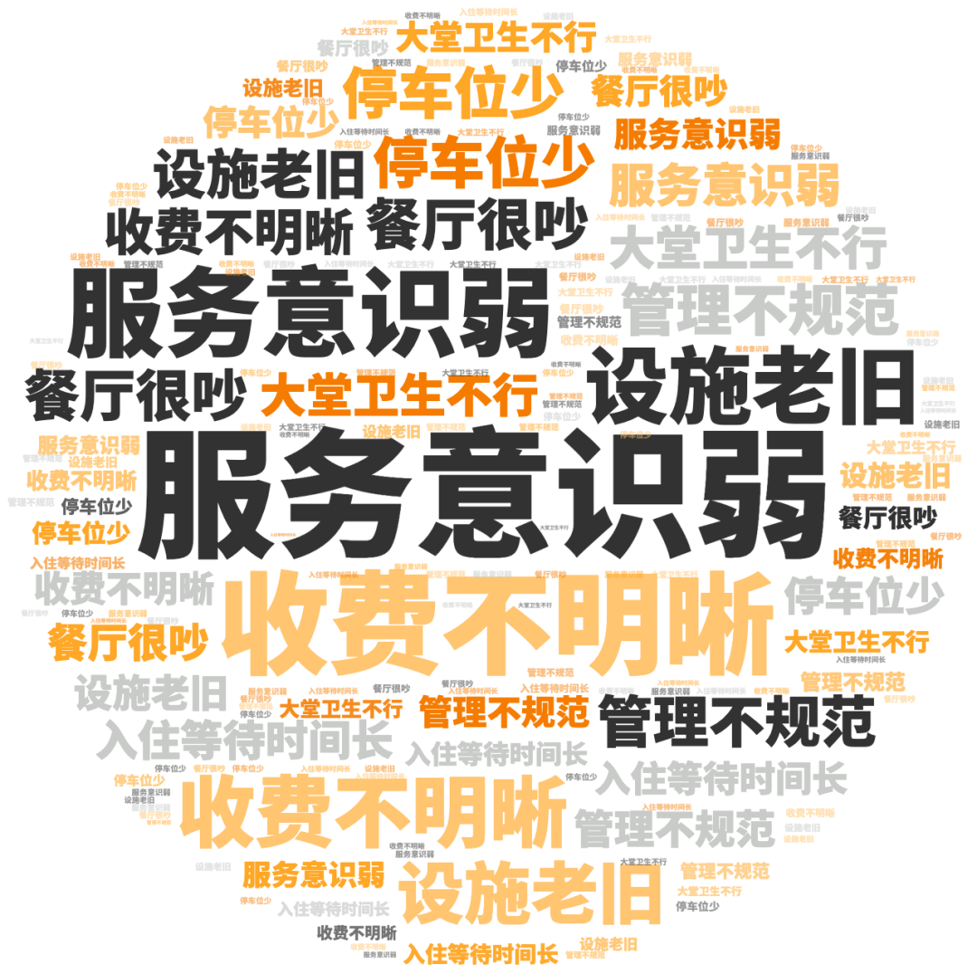 点评指数:地产酒店点评指数平均得分达到110.15分,指数环比出现下跌,本月未出现300分的品牌。好评维度平均是差评维度的1.37倍。好评关键词主要是配套设施丰富、地理位置好、服务贴心等方面。差评关键词主要集中在设施老旧、等候入住久、卫生差等方面。
