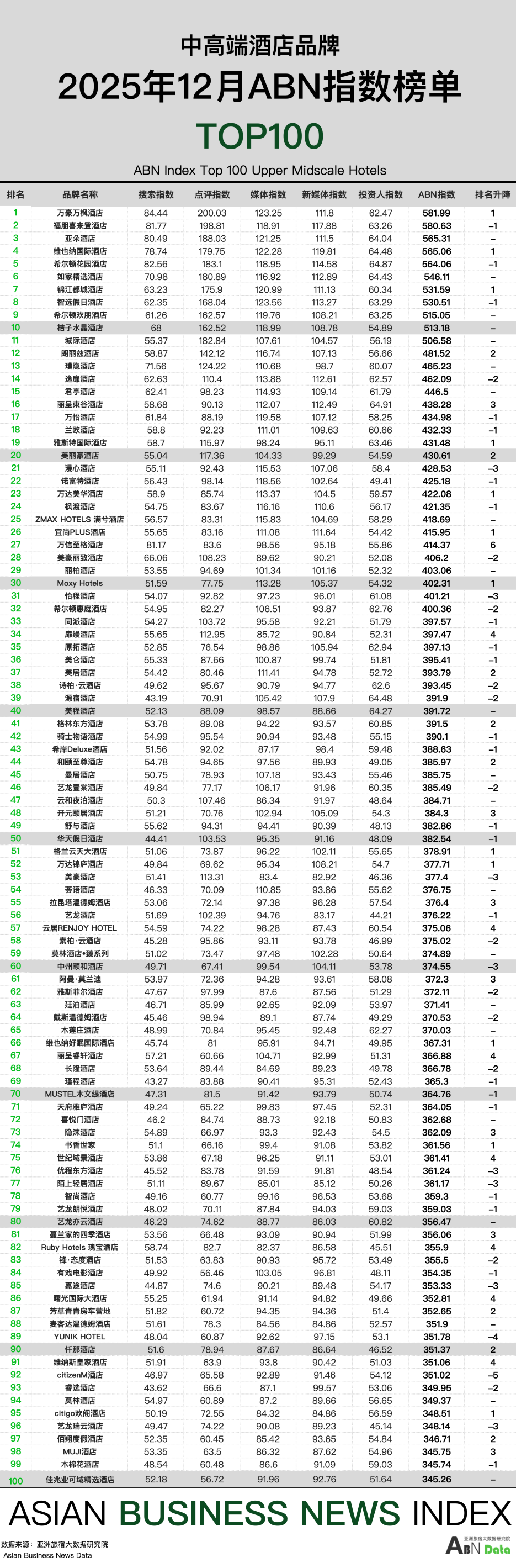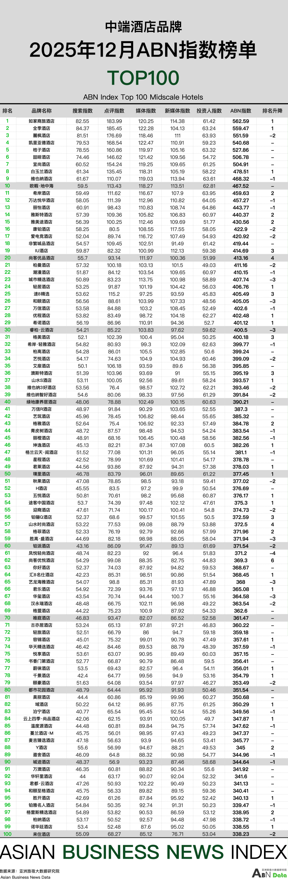 综述:2025年12月,中端酒店的媒体指数、新媒体指数以及投资人指数保持高位,五个指数监测综合平均得分达到了391.64。