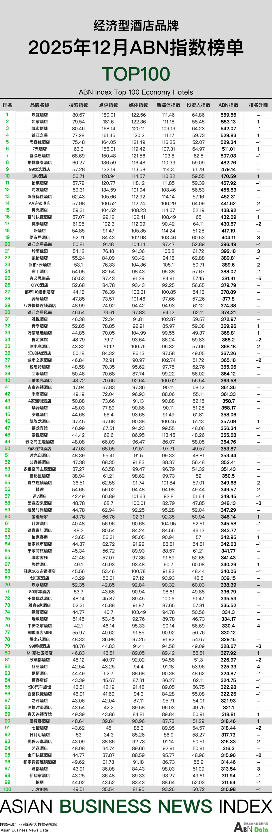 综述:2025年12月,经济型酒店五大指数均有不同幅度地下跌,综合平均得分达到了371.89。
