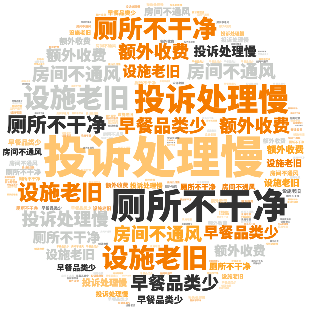 点评指数:经济型酒店点评指数平均得分达72.8分,整体出现显著下降,未有300分品牌出现,好评维度平均是差评维度的0.9倍。好评关键词主要是经济型酒店的入住快、设施新、性价比高等方面。差评关键词主要集中服务意识弱、有异味、态度敷衍等方面。