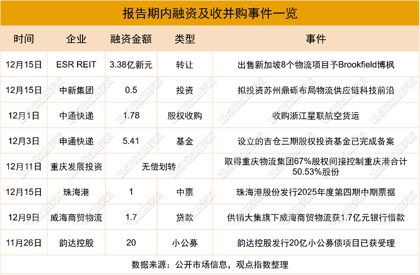 与此同时,12月,物流产业资本运作热度持续攀升。菜鸟与中国人寿联合发起规模17亿元的仓储物流专项基金,重点投向长三角及长江中游城市群的高标准仓储设施。