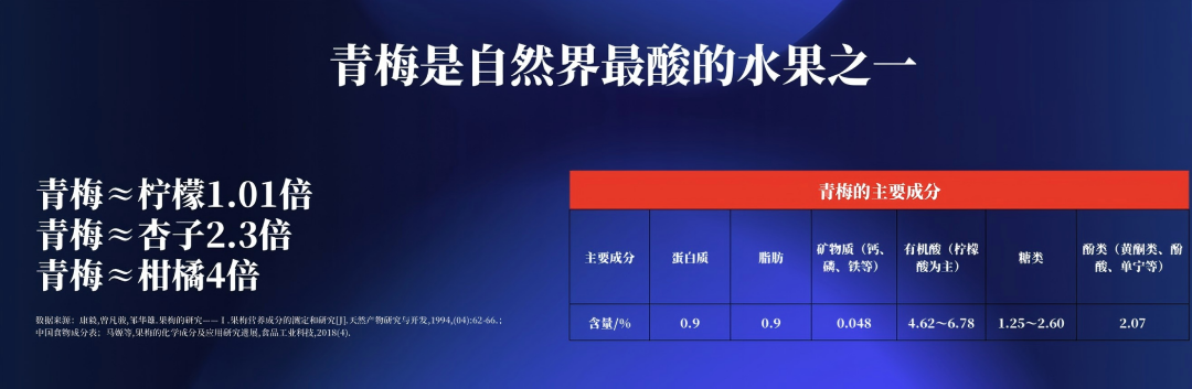 青梅富含柠檬酸、苹果酸等多种天然有机酸,含量在4.62%~6.78%,是柑橘的4倍、柠檬的1倍,如果直接食用通常让人把脸皱成一团。