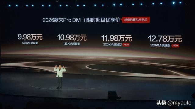 2026年1月10日,2026款比亚迪宋Pro DM-i 220km在深圳上市,全系限时价格为9.98万——12.78万元。另外,汉唐家族将推“9系”新车,未来车型阵容会更加庞大。