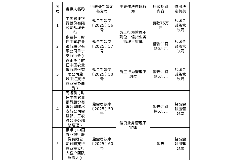 罚单显示,中国农业银行股份有限公司盐城分行的主要违法违规事实(案由)为:员工行为管理不到位、信贷业务管理不审慎。