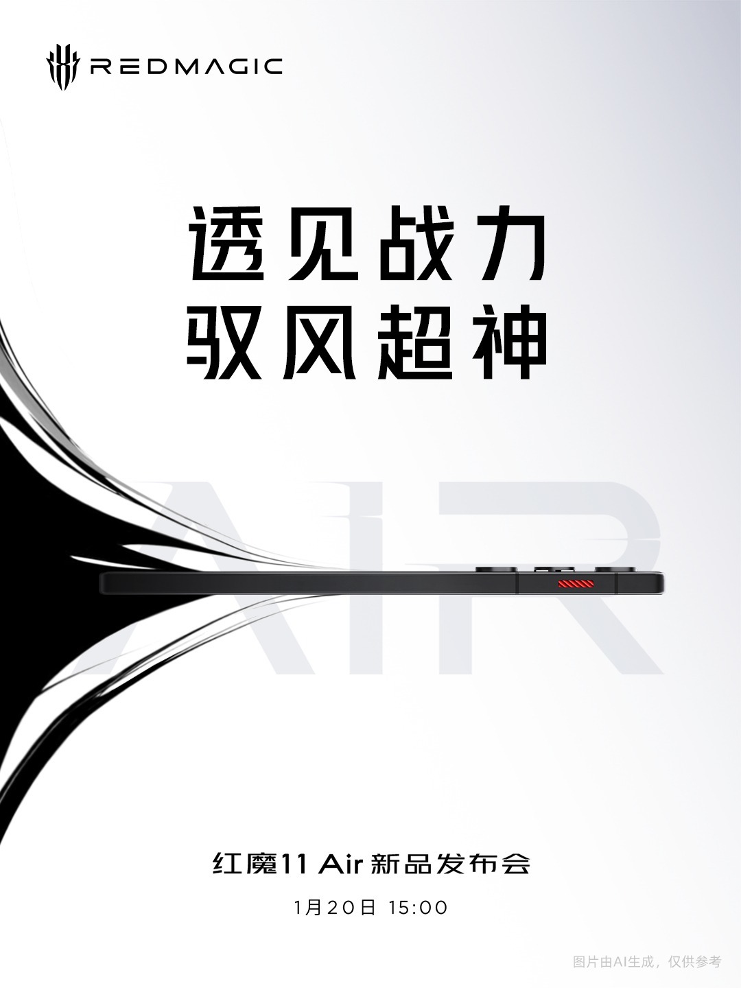 1月12日消息,红魔游戏手机官方正式官宣,红魔11 Air新品发布会将于1月20日15:00线上举办。官方同步曝光的海报展示了新机的侧面设计,其宣传语“透见战力,驭风超神”也提前揭晓,引发不少游戏玩家关注。