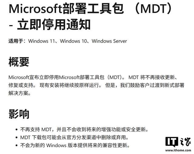 IT之家援引博文介绍,MDT 最初发布于 2003 年 8 月,曾是企业环境中自动化部署 Windows 客户端和服务器的主流免费工具。然而,随着现代化替代方案的成熟,这款“老将”最终迎来了谢幕。