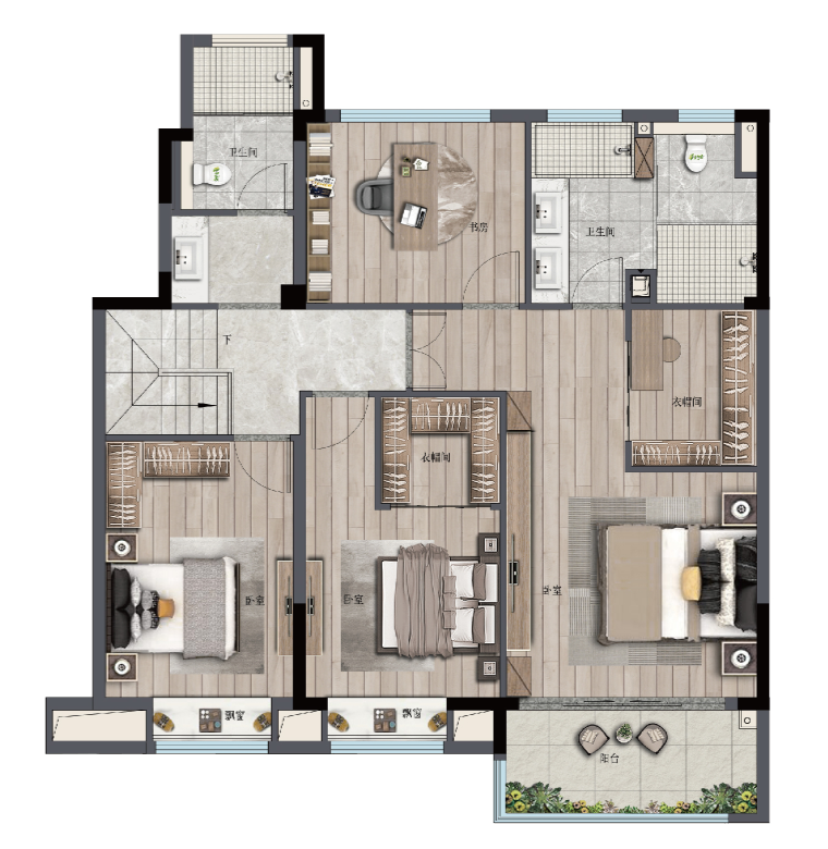主卧套房更以完备功能配置定义奢华私域——独立书房+步入式衣帽间+星级酒店级卫浴+阔绰瞰景阳台一应俱全,成就一个兼具尺度、私密与格调的专属世界。