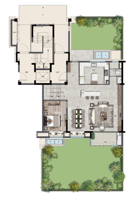 超大面积南北双庭院,实现功能互补与精神共融——南院阳光充沛,适合莳花弄草与孩童嬉戏;北院清幽宁静,可作为品茶漫谈的理想角落;两院相辅相成,共同承载着家庭成员各自的情感寄托。