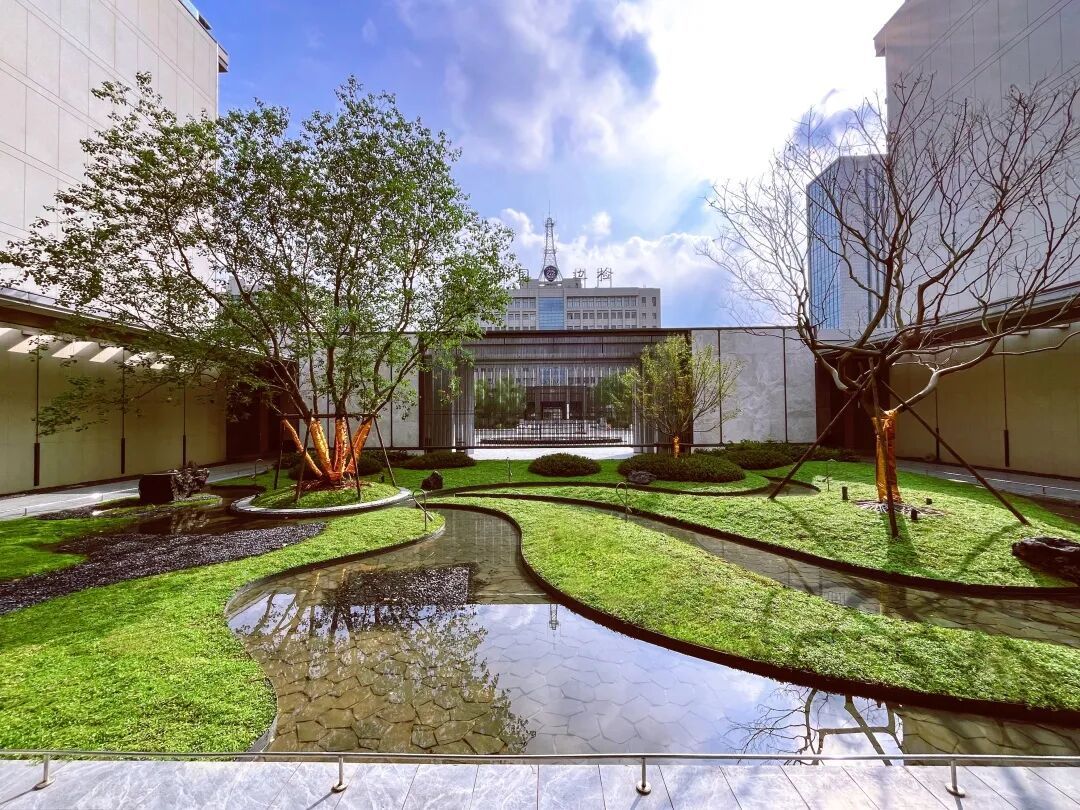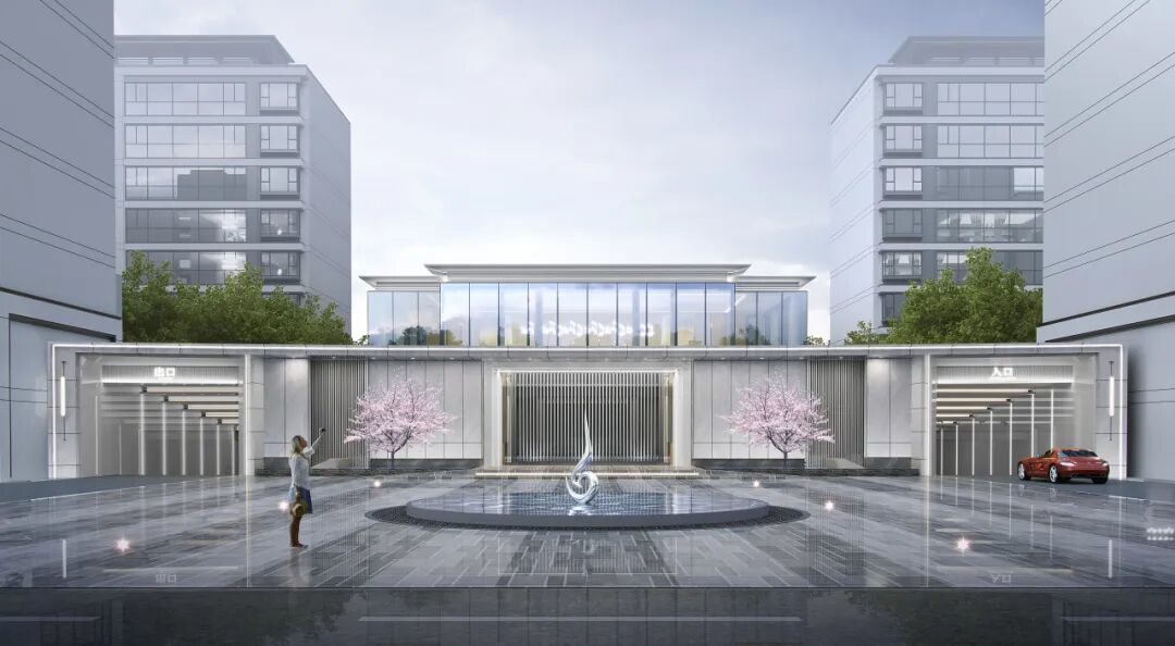 外立面采用大面积LOW-E玻璃幕墙与浅灰色铝板,勾勒出通透澄澈的“天空之镜”意象;