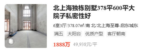 紧邻蝶湖公园的北上海至尊,一套建面约378㎡的独栋别墅,挂牌价竟高达1888万,单价逼近5万/㎡。