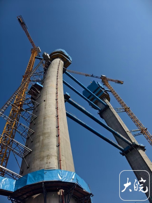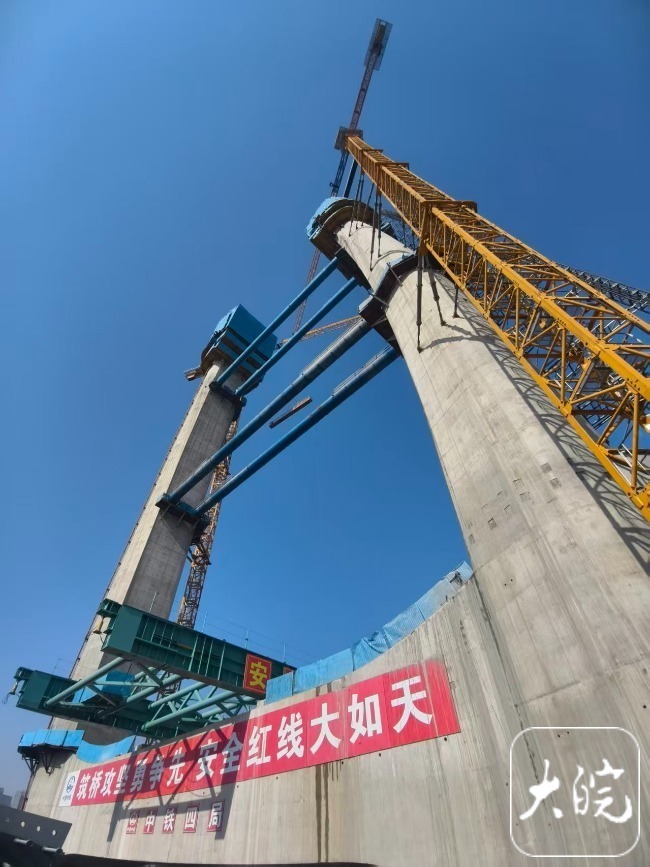 上午11时许,施工现场一派繁忙景象。由中铁四局承建的大桥21号主塔,正在进行第22节段的混凝土浇筑作业。记者在现场看到,搅拌均匀的成品混凝土通过泵站加压,沿着长长的泵管源源不断输送至百米高的塔顶浇筑工作面,各项工序有条不紊推进。项目相关负责人告诉记者,主塔高度突破100米,不仅是工程建设的重要节点,更意味着后续施工将面临更高的安全与技术挑战。