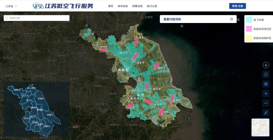近期,江苏省低空飞行服务中心根据《无人驾驶航空器飞行管理暂行条例》规定,公布江苏微型、轻型、小型无人驾驶航空器适飞空域范围。