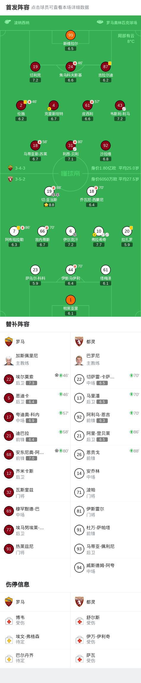 第35分钟,弗拉希奇助攻,切-亚当斯外围起脚射门得分,都灵1-0罗马