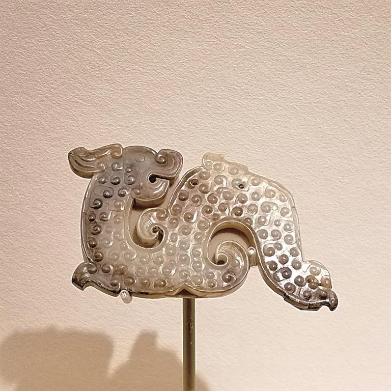 展厅中,一件小小的山形青铜节约讲述了楚文化与草原文化交流的故事。节约是古代马具,多为青铜或骨质,功能为穿连固定马笼头、辔带,使其连为一体,保持固定的交叉状,以达到制马的目的。这件器物带有明显的北方草原地区风格,是楚文化与北方草原地区交往的见证。
