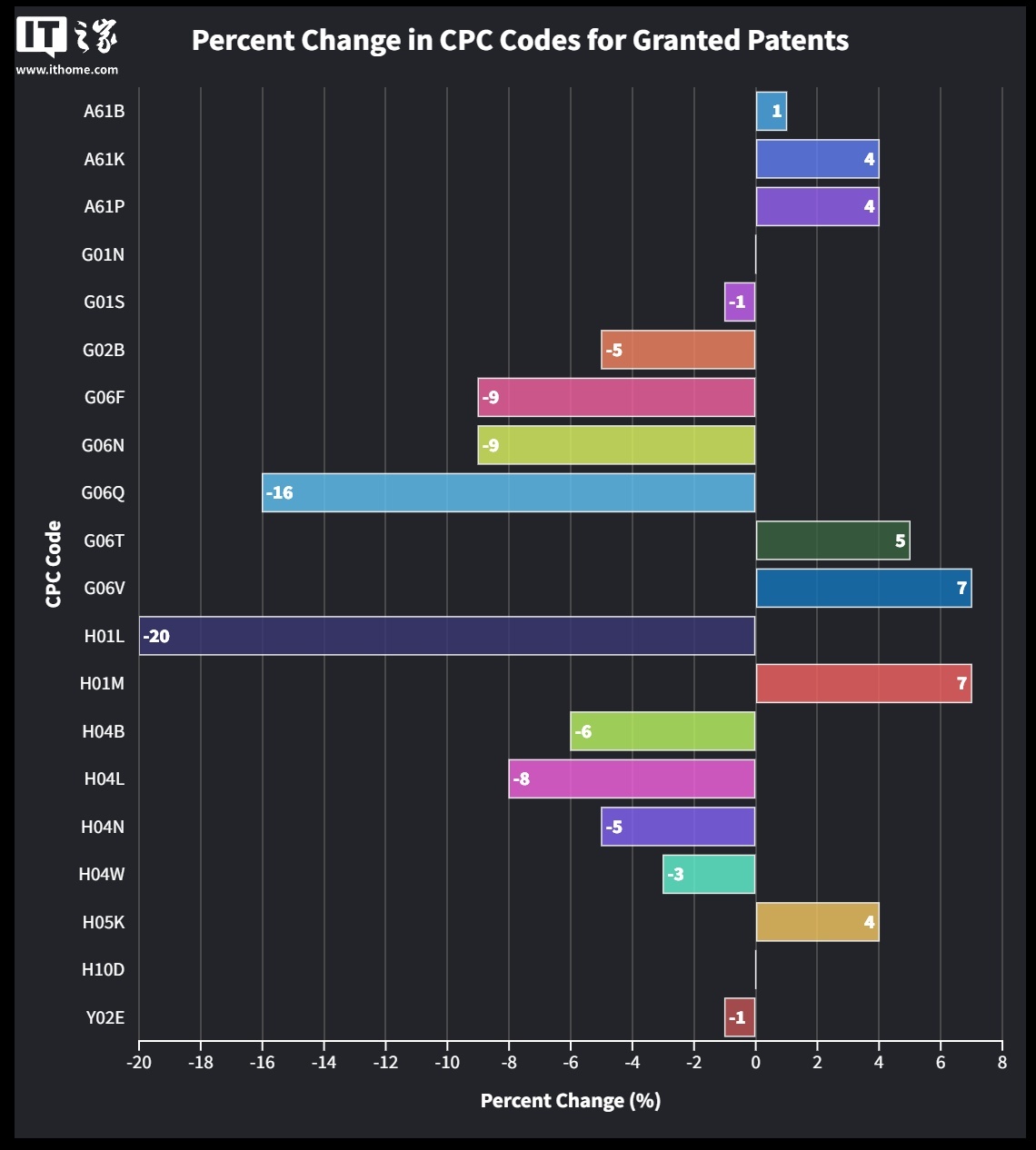 在技术细节方面,报告揭示了半导体领域的显著风向转变。尽管 AI 发展对芯片需求旺盛,但传统芯片专利(H01L 类别)的获批量却同比下降了 20%。
