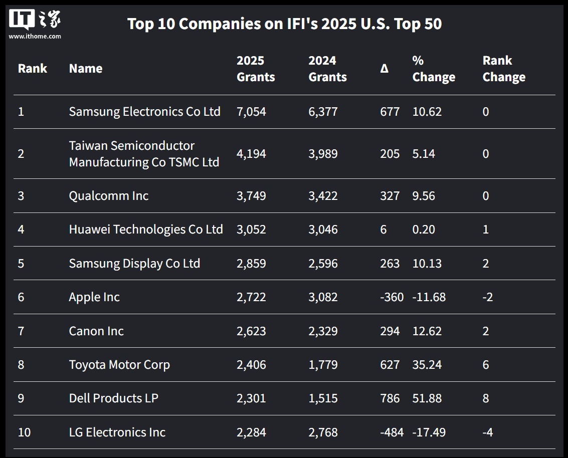 苹果公司排名跌至第七位,全年获得 2722 项专利授权,同比下降 11.6%;三星电子以 7054 项专利授权(增长 10.6%)稳居榜首,台积电、高通、华为紧随其后。