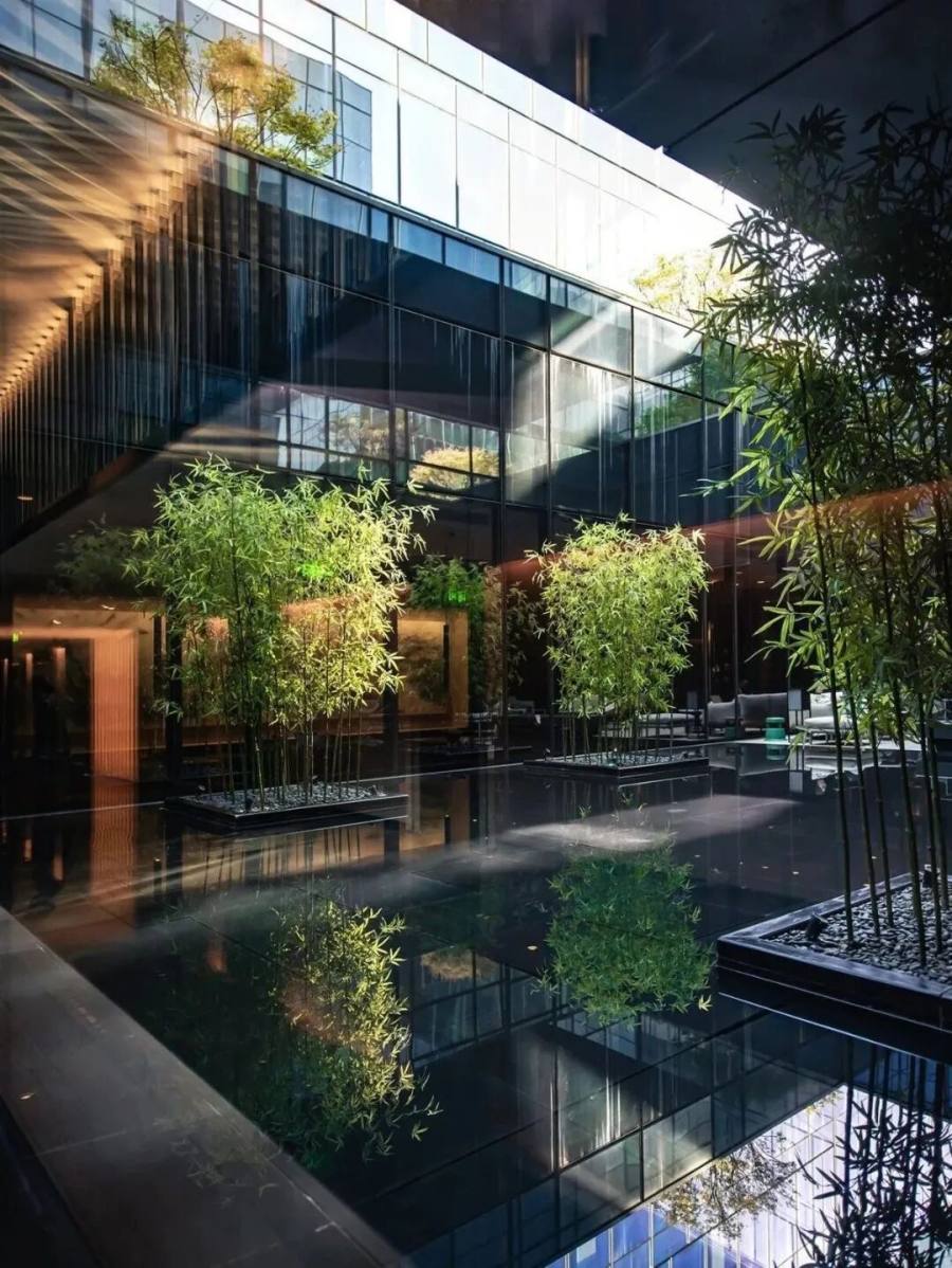 这里不见寻常酒店的封闭柜台,几张古色古香的案几前,温文尔雅的侍者起身相迎,落座间便办妥入住手续,妥帖得如同老友相见。最勾人驻足的是大堂墙上的巨幅火药爆破画——硝火散尽,画布上点线面交织成天然肌理,或似烟雨江南,或如残雨笼晴,更泛着天然大理石般的莹润光泽,能映出观者身影。中庭竹石水影勾勒出江南婉约,房间内一瓶梅、一盆兰暗吐幽香,取景框般的落地窗更妙,将故宫金碧、北大红楼文韵、景山四时景致一并收揽,那日西沉的夕阳,为这幅流动的画卷镀上了一层金边。后来才知,酒店大股东正是嘉德艺术中心,艺术与生活的交融,早已埋下伏笔。