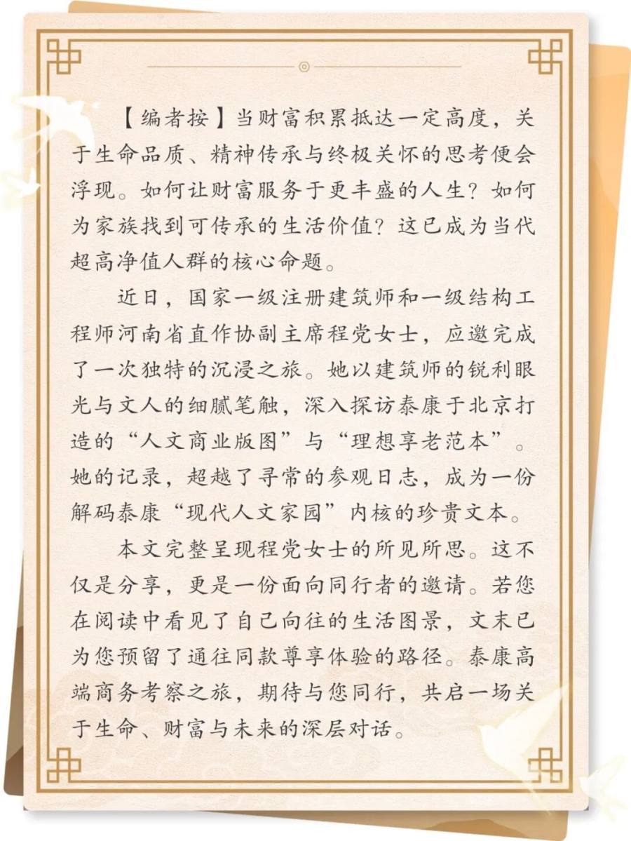 夜色已深,研修院的灯火沉静如星。这一日的跋涉与凝视,最终沉淀为一份确信:真正的传承,从不是复刻旧物,而是以当代的砖石与精神,为永恒的价值,建一座新的殿堂。领略了泰康植根于城市核心的文化艺术底蕴,我们的旅程并未结束。次日,程党女士的车辙驶向北京城郊,去探访一个更为震撼、颠覆想象的所在——那里,藏着泰康对生命历程最温暖、最具体的回答。(程党)