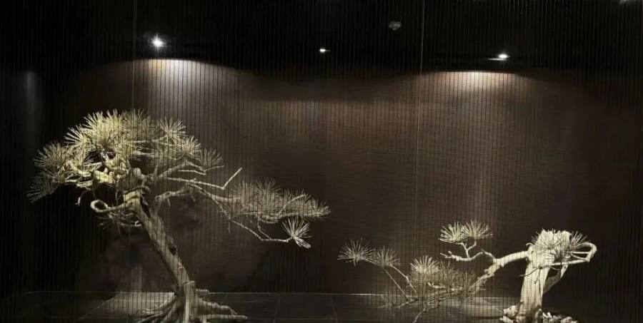 乘梯至璞瑄酒店四楼大堂,第一眼便撞见那株由建筑废料与古木雕琢而成的迎客松。根须盘虬如岁月凝痕,枯枝新韵间漾着几分禅意。