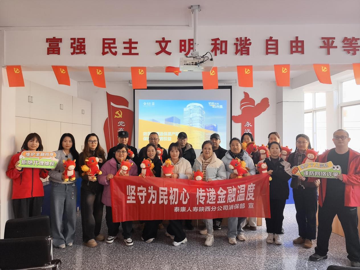 26年1月14日,辞旧迎新之际,为切实提升社区居民金融素养,筑牢财产安全防护网,同时让大家感受浓浓的马年年味,泰康人寿陕西分公司联合永宁社区特开展“防范非法代理退保 守护金融安全 喜迎金马新春”主题宣传活动,将实用的金融知识和吉祥的新年祝福送到居民家门口。