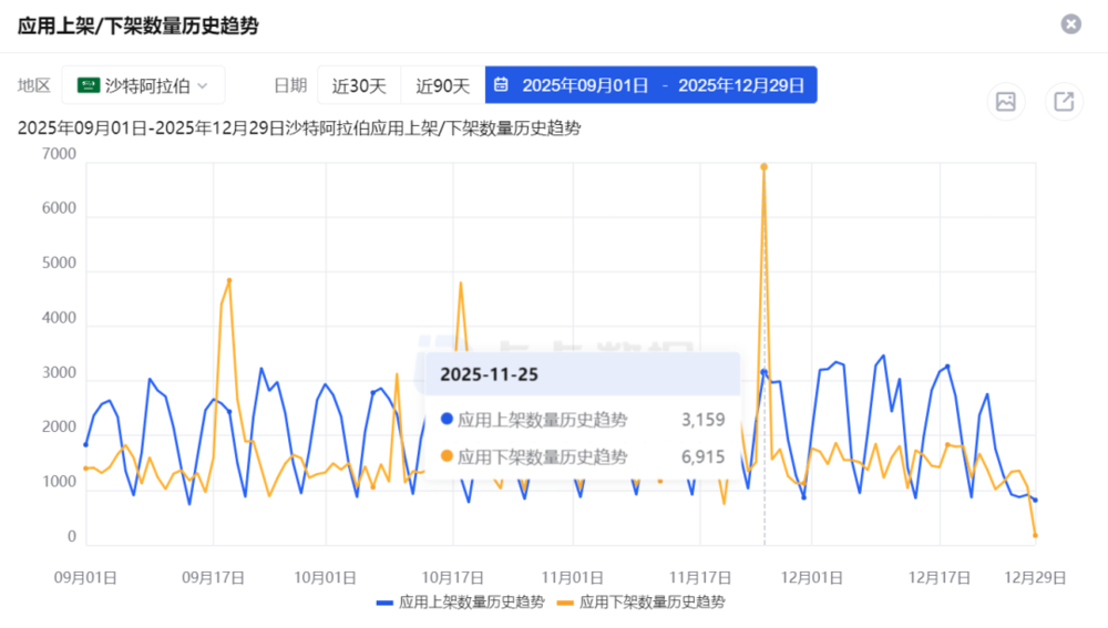 图源:点点数据 沙特2025年11月25日当天,社交应用下架数量曾达到6915