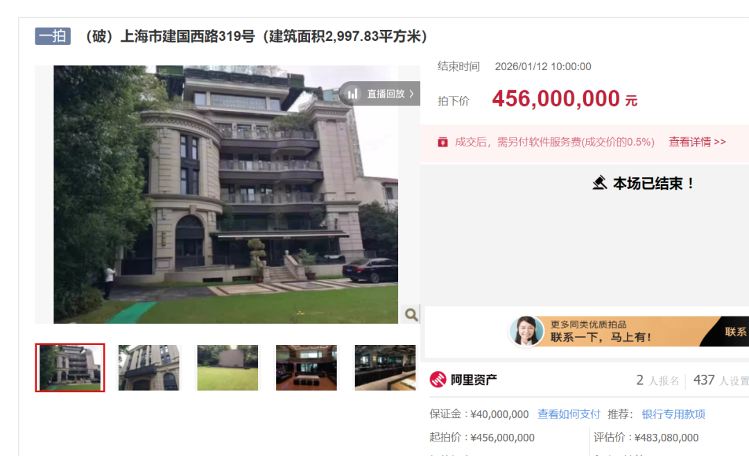 根据公告详情,购入标的通过阿里资产法拍竞买,位于上海市徐汇区衡复风貌核心地段建国西路319号,临近衡山公园、徐家汇公园、武康路等,最早源自抗战年间英国人所建,占地面积2163平方米,建筑面积2997.83平方米,其中房屋占地面积617平方米,花园占地面积1546平方米,沿街独栋,高4层,地下1层,带有防空洞,使用期限至2064年,评估价4.83亿元,评估单价16.1万元/平方米,可作为企业总部、艺术机构、私人会所等。