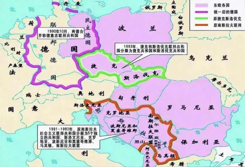 上世纪80年代末,东欧各国政局动荡。西德趁势四处游说,在取得美苏认可的情况下,于1990年合并了经济濒于崩溃的东德,德国再度统一。
