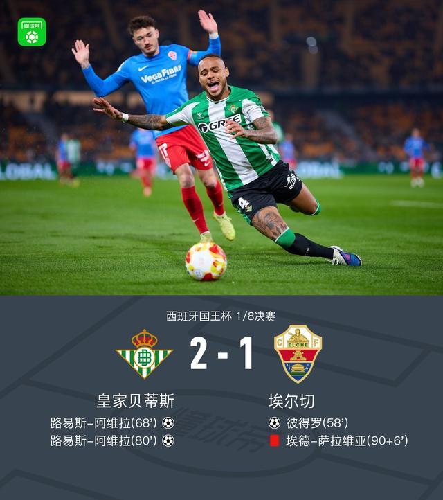 北京时间1月15日,西班牙国王杯1/8决赛展开较量,皇家贝蒂斯与埃尔切狭路相逢。比赛中,彼得罗接阿芬格鲁贝尔的精准传球率先破门,为埃尔切取得领先。随后,福尔纳尔斯送出助攻,路易斯-阿维拉建功,帮助皇家贝蒂斯扳平比分。比赛进入尾声阶段,鲁伊瓦尔成功策动进攻,路易斯-阿维拉再度破门完成梅开二度,助力球队实现反超。下半场补时阶段,埃德-萨拉维亚因犯规被红牌罚下。最终全场比赛结束,皇家贝蒂斯以2比1逆转战胜埃尔切,成功晋级下一轮。