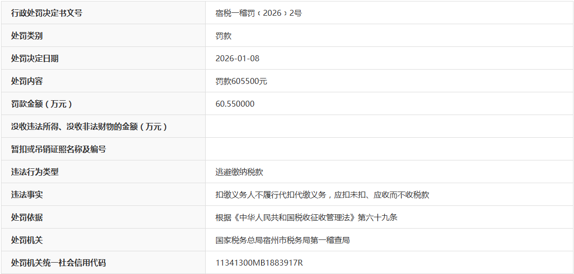 依据《中华人民共和国税收征收管理法》第六十九条,国家税务总局宿州市税务局第一稽查局对该公司罚款60.55万元。行政处罚决定书文号是宿税一稽罚﹝2026﹞2号。