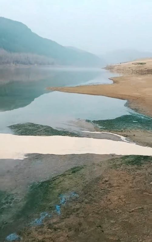视频里,本来还清澈的河水,一段里呈现出浑浊的颜色。河岸的一侧有茂盛的植被,另一侧是河滩。