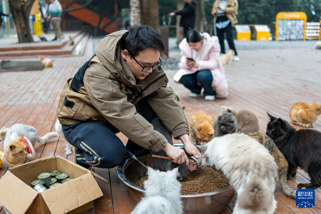 1月14日,在重庆市南岸区南滨路萤火虫港湾猫猫主题乐园,工作人员为园区内的猫咪准备食物。