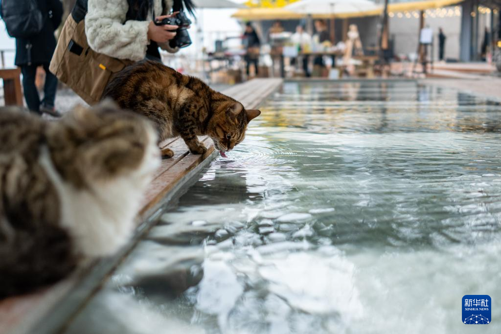 1月14日,在重庆市南岸区南滨路萤火虫港湾猫猫主题乐园,猫咪在流动水池饮水。