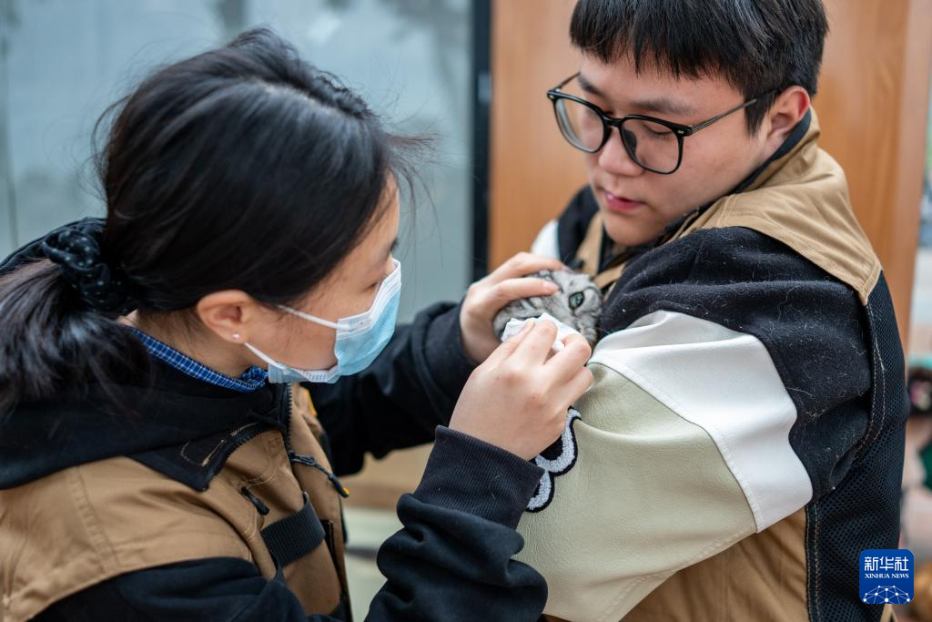 1月14日,在重庆市南岸区南滨路萤火虫港湾猫猫主题乐园,工作人员在照顾眼部不适的猫咪。