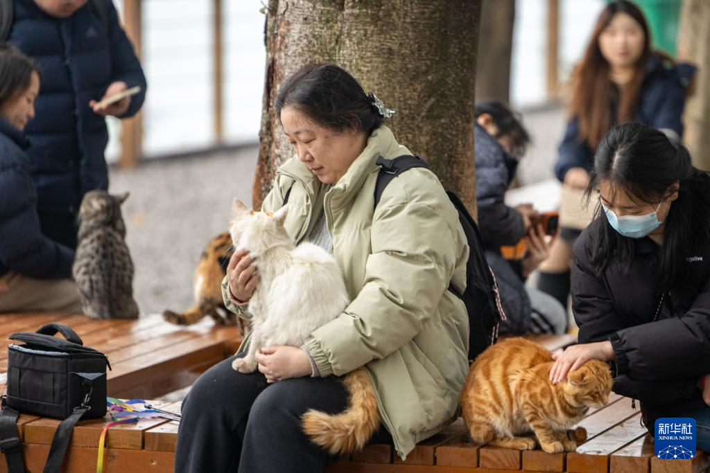 1月14日,在重庆市南岸区南滨路萤火虫港湾猫猫主题乐园,游客和猫咪互动。