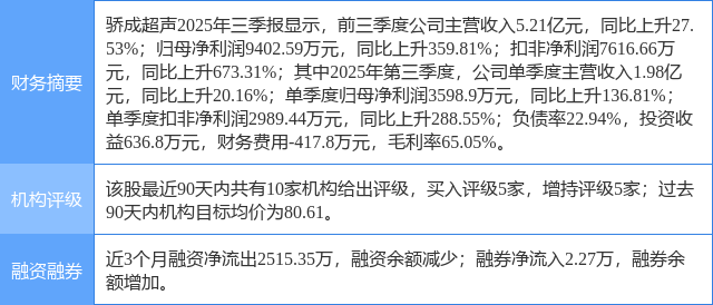 2025年10月30日,东吴证券研究员曾朵红,阮巧燕,朱家佟发布了对骄成超声的研报《2025年三季报点评:业绩符合预期,先进封装实现突破》,该研报对骄成超声给出“买入”评级。研报中预计公司25-27年归母净利1.3/2.4/4.1亿元(此前预期1.5/3.0/5.0亿元),同比+57%/+75%/+72%,对应PE99/57/33x,维持“买入”评级。证券之星数据中心根据近三年发布的研报数据计算,该研报作者对此股的盈利预测准确度为72.59%。