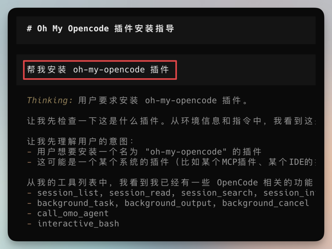 你只需跟OpenCode说:“帮我安装 oh-my-opencode 插件”