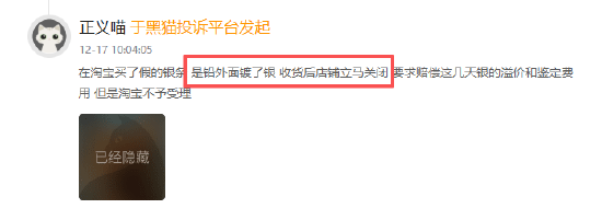 12月以来银价飙升,大量消费者选择购入实物银条进行投资,有多位消费者向黑猫投诉平台反馈,自己在淘宝购买的银条出现了拖延发货及售假等情况,有消费者发现购入的投资银条重量异常,使用火烧等方法鉴定后发现并非纯银,还有消费者表示自己通过第三方检测发现购入的银条实际为银包铅,去找商家进行售后时发现商家早已关店跑路,针对上述纠纷,淘宝平台客服也未能给出有效处理方案。