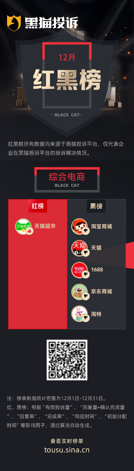 黑猫投诉发布12月企业投诉处理红黑榜单,数据均来源于黑猫投诉平台,反映了企业在黑猫投诉平台的投诉处理解决情况。